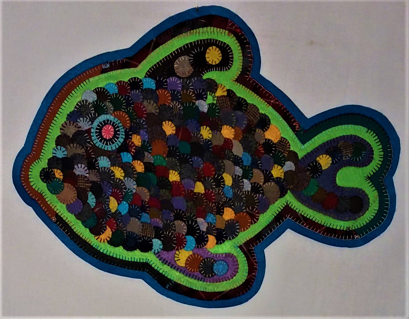 Unique, original designs are assembled using various weights and shades of woolens, synthetic fabrics and felts and two common embroidery stitches, to reinterpret color, shape and spatial frolic, evident in her work. In January 1997, Country Living Magazine, published her “meticulous hand-stitched”, undulating, eye-popping designs. Using various needles and threads on hand-cut felt pieces amplifies the visual freshness, enthusiasm and sophisticated naïveté trademark in her work.
