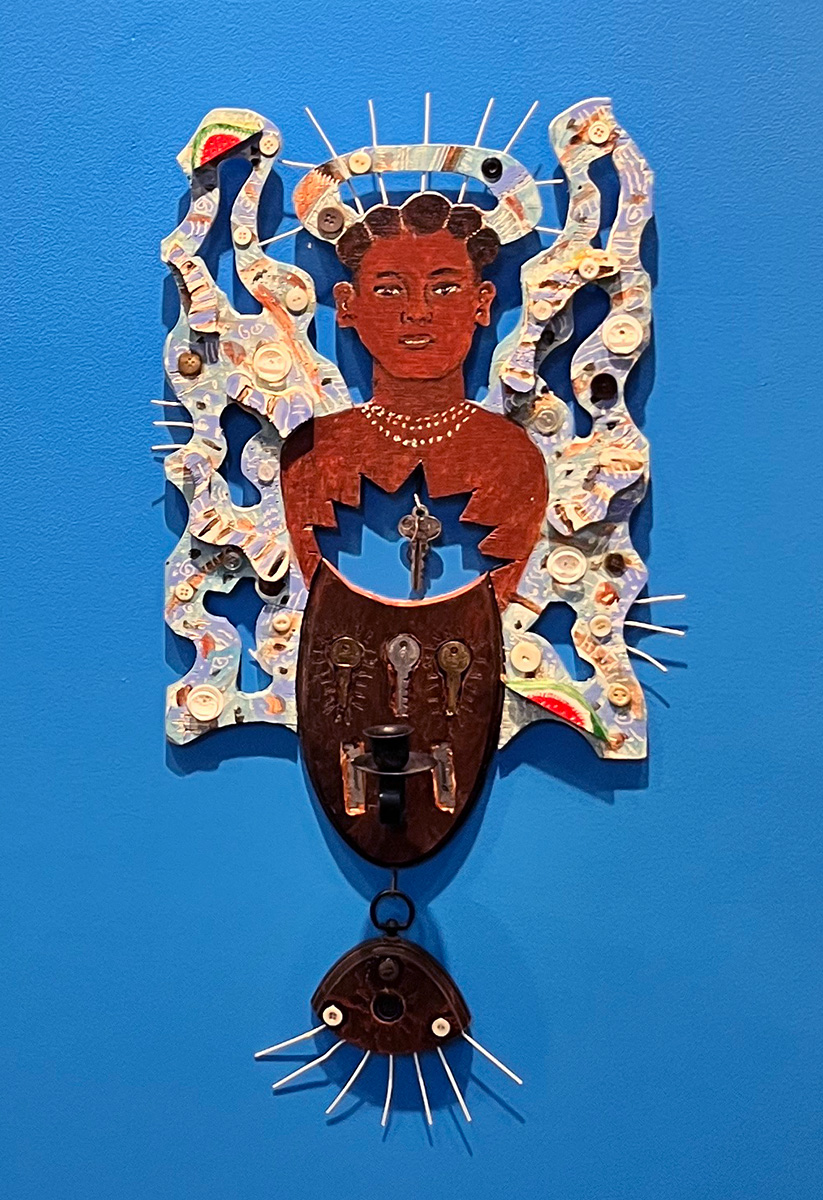 My art works are open-ended narratives inspired by travel, music, literature, folklore, and everyday events. Mixed-media assemblage paintings on wood often incorporate discarded objects. Keys and locks represent tools of access. Watermelon slices refute negative stereotypes by representing positive aspects of the African diaspora. Glass shards, metal, buttons, playing cards—all become part of the materials telling a story.